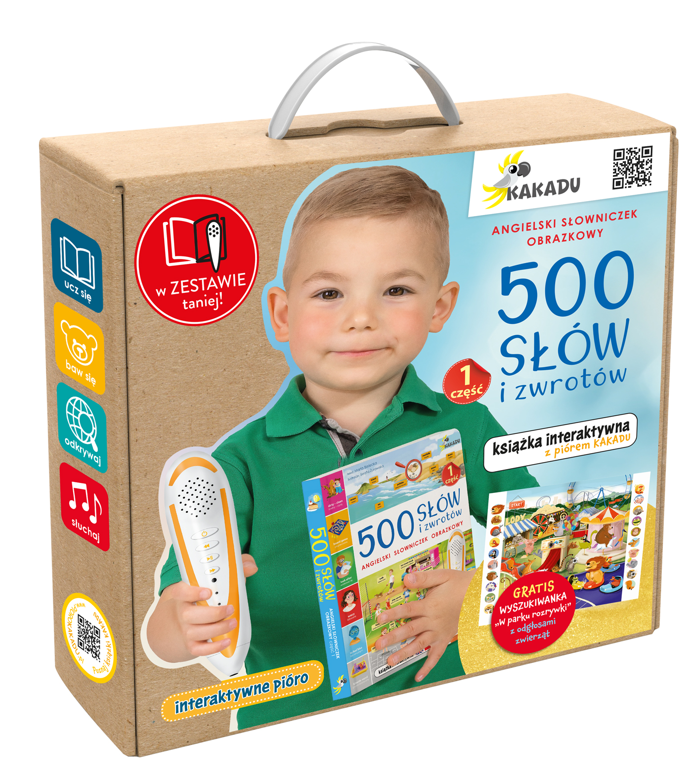500 słów i zwrotów. Angielski słowniczek obrazkowy cz. 1 to interaktywna książka z piórem Kakadu, które uruchamia zakodowane na stronach teksty i dźwięki. Publikacja jest częścią innowacyjnego systemu nauki i zabawy w jednym.