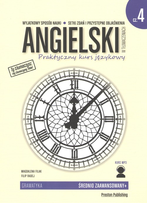 Czwarta część praktycznego kursu języka angielskiego, który łączy w sobie ćwiczenie umiejętności mówienia z nauką zagadnień gramatycznych. Zawiera klarowne objaśnienia oraz ponad 1200 zdań i niezbędnych wyrażeń na poziomie średnio zaawansowanym plus (B2) wraz z odpowiedziami. Angielski w tłumaczeniach. Gramatyka 4 zawiera:omówienie tematów językowych takich jak: porównanie czasów, porównanie czasu Present Perfect z Past Simple, czasowniki nieregularne, there we wszystkich czasach, strona bierna, porównanie czasowników say & tell, relative clauses, zdania określające cel, kontrast, przyczynę, czasowniki modalne ??prawdopodobieństwo, czytanie liczb, mowa zależna, często popełniane błędy i inne,ponad 1200 zdań języka mówionego specjalnie wyselekcjonowanych dla potrzeb uczących się, odpowiadających poziomowi B2 w skali europejskiej,wskazówki i objaśnienia, które wspomagają przyswajanie wiedzy i zrozumienie omawianych zagadnień,prosty i przejrzysty układ książki, umożliwiający ćwiczenie od samego początku, a jednocześnie sprawdzanie błędów i przyswajanie dodatkowej wiedzy,ponad sześciogodzinny kurs audio mp3 (lektorzy natywni) do ćwiczenia wymowy i mówienia w dwóch wersjach: polsko-angielskiej i angielskiej.