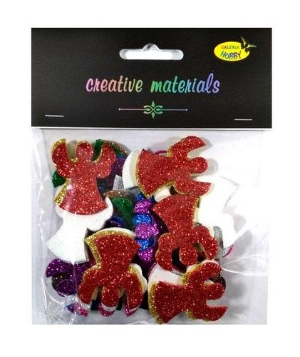 Zestaw elementów w formie aniołów z pianki brokatowej wielkości 40 mm , zawierający ok. 50 elementów, pakowany w eleganckie opakowanie z eurozawieszką. Elementy można naklejać na każdą powierzchnię lub używać do innych zdobień. Opakowanie zawiera miks kolorystyczny elementów.