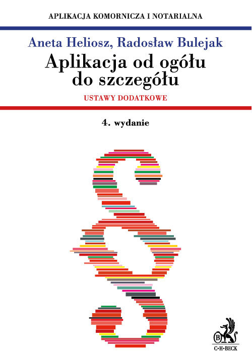 Aplikacja od ogółu do szczegółu - ustawy dodatkowe to kontynuacja popularnej wśród aplikantów pozycji Aplikacja od ogółu do szczegółu autorstwa p. Anety Heliosz. Niniejsze opracowanie to: streszczenie podstawowych, a zarazem najważniejszych wiadomości zaczerpniętych z aktów normatywnych, których znajomość jest obligatoryjna na egzaminie wstępnym na aplikacje komorniczą i notarialną, pozycja adresowana przede wszystkim do absolwentów prawa, osób przygotowujących się do egzaminu wstępnego, jak również dla prawników, którzy poszukując pracy, przystępują do konkursów, np. na asystenta sędziego, "wyciągnięcie przed nawias" najważniejszych informacji z kilkudziesięciu aktów normatywnych, co ułatwia naukę, a zarazem powtórkę materiału, pozycja dla zapracowanych osób, którym ciągle brakuje czasu. Komplet dwóch książek stanowi niezbędnik dla osób przygotowujących się do egzaminów na aplikacje komorniczą i notarialną i wyczerpuje wykaz aktów normatywnych ogłaszanych przez Ministerstwo Sprawiedliwości.