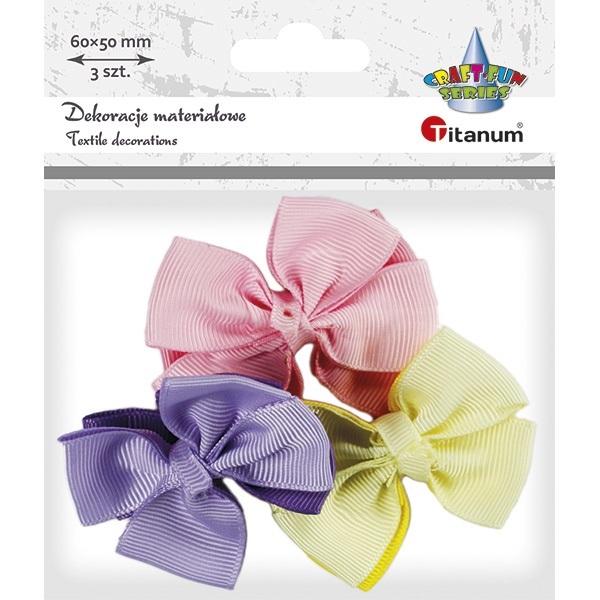 Aplikacje materiałowe kokardki 60x50mm rypsowe fioletowe, różowe, żółte 3szt.