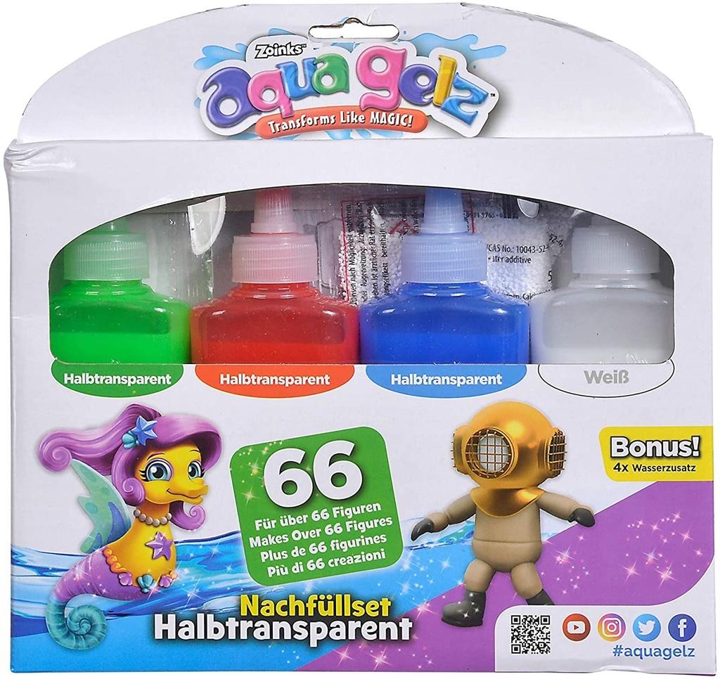 Zestaw uzupełniający z półprzezroczystymi kolorami zawiera 4 butelki żelu kolorowego o pojemności 165ml w kolorach niebieskim, zielonym, czerwonym i białym oraz 4x dodatki do wody.