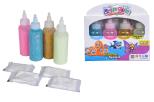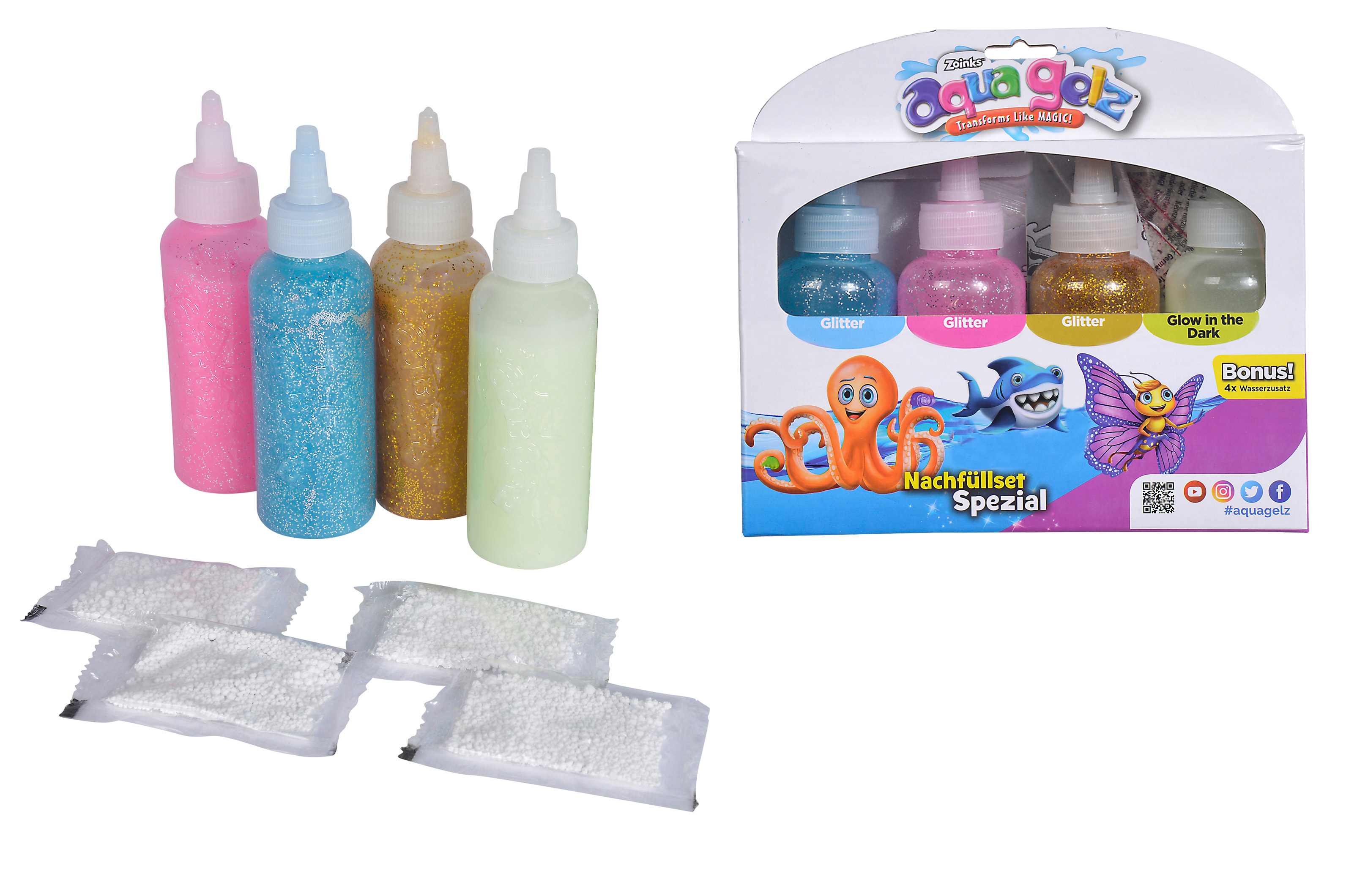 Zestaw uzupełniający z specjalnymi kolorami zawiera 4 butelki żelu kolorowego o pojemności 100ml w kolorach różowym, niebieskim, złotym i srebrnym z brokatem, butelkę z żelem kolorowym Glow in the Dark oraz 4x dodatki do wody.