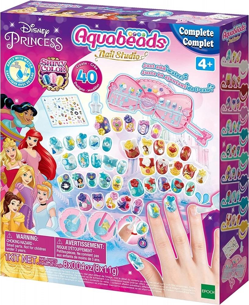 Stylizuj paznokcie w studiu stylizacji paznokci Aquabeads księżniczki Disneya! Elementy ozdobne należy wyjąć z szablonu i ułożyć na stoliku w kształcie kokardki. Następnie włożyć szablon z paznokciami pod serce stolika. Paznokcie ozdabia się naklejkami oraz elementami ozdobnymi. Zdobienia przyklejają się po zwilżeniu paznokci wodą i dociśnięciu. Po ozdobieniu paznokci należy wyjąć je z szablonu. Własne paznokcie należy teraz zwilżyć wodą i przymocować do nich gotowe, ozdobione paznokcie. Paznokcie przykleja się tylko za pomocą wody, klej nie jest potrzebny. Aby kolorowe paznokcie dobrze się przykleiły, należy odczekać około 5 minut. W celu zdjęcia paznokci wystarczy je lekko docisnąć, a następnie przesunąć w przód i w tył. Paznokcie Aquabeads można zakładać wielokrotnie. Składniki paznokci Aquabeads są rozpuszczalne w wodzie, dlatego w przypadku kontaktu z wodą paznokcie Aquabeads mogą się odkleić od palców. Studio stylizacji paznokci Aquabeads księżniczki Disneya zawiera stolik, pincetę, paznokcie w ośmiu kolorach, flakonik na wodę z pędzelkiem do zwilżania paznokci oraz liczne ozdoby i naklejki. Produkt przeznaczony dla dzieci od czterech lat.
