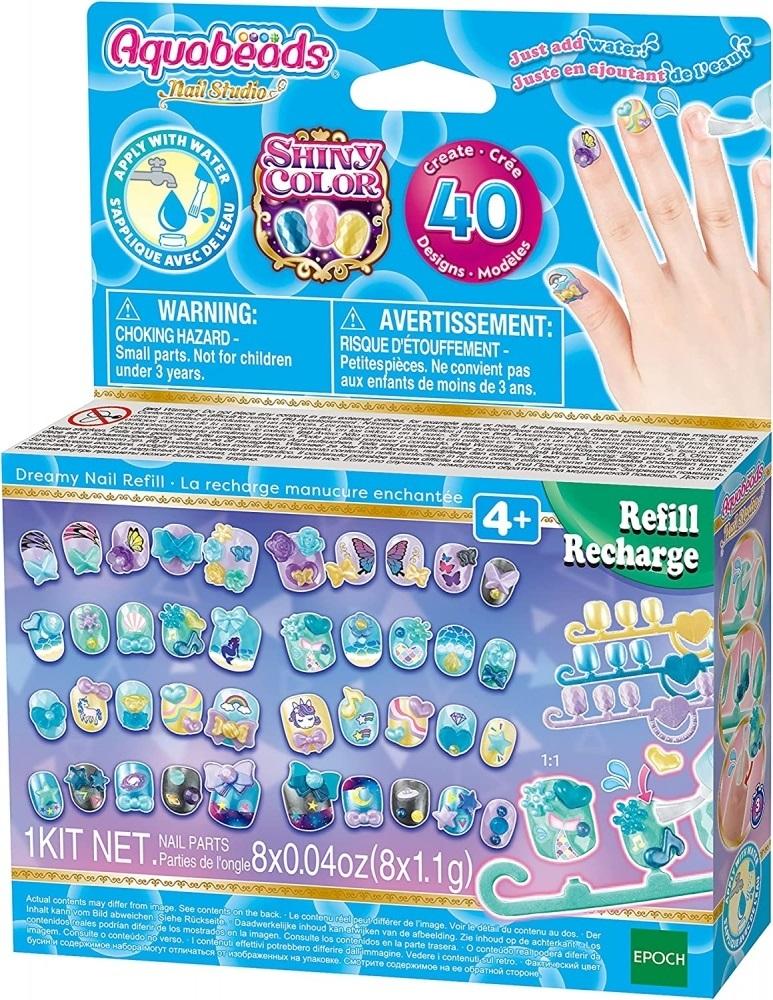 Zestaw uzupełniający paznokci Aquabeads umożliwia nieograniczone tworzenie kolejnych stylizacji. Niebiesko-zielony zestaw uzupełniający zawiera paznokcie w 8 kolorach i naklejki do ich ozdabiania. Umożliwia on stworzenie nawet 40 kreatywnych stylizacji. Produkt przeznaczony dla dzieci od 4 roku życia.