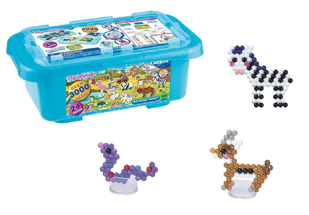 Koraliki Aquabeads oryginalne od 2004 roku! Wielka zabawa z mega zestawem koralików Aquabeads Safari. Na pokrywie pudełka można tworzyć figurki na dwóch podkładkach do układania koralików, wyposażonych w system Flip Tray. Sposób postępowania: Ułożyć motyw, spryskać go wodą, odwrócić Flip Tray i pozostawić figurkę do wyschnięcia. Po odwróceniu podkładka do układania koralików jest znowu wolna i można dalej tworzyć na niej nowe figurki. Możliwe do ułożenia wspaniałe motywy safari, takie jak bawół, flaming, żyrafa, krokodyl, lew, zebra, hipopotam, papuga, jeep i wiele innych. Szablony umożliwiają ułożenie ponad 30 różnych figurek. Sceneria safari oraz ustawione na podstawkach figurki pozwalają przenieść się w świat pełen przygód i zabawy. Zestaw koralików Aquabeads ""Safari"" zawiera ponad 3000 kolorowych koralików do zabaw kreatywnych, pudełko z 2 podkładkami do układania koralików i systemem Flip Tray, spryskiwacz, scenerię do zabawy i 10 podstawek. W dużym pudełku można przechowywać całe wyposażenie.