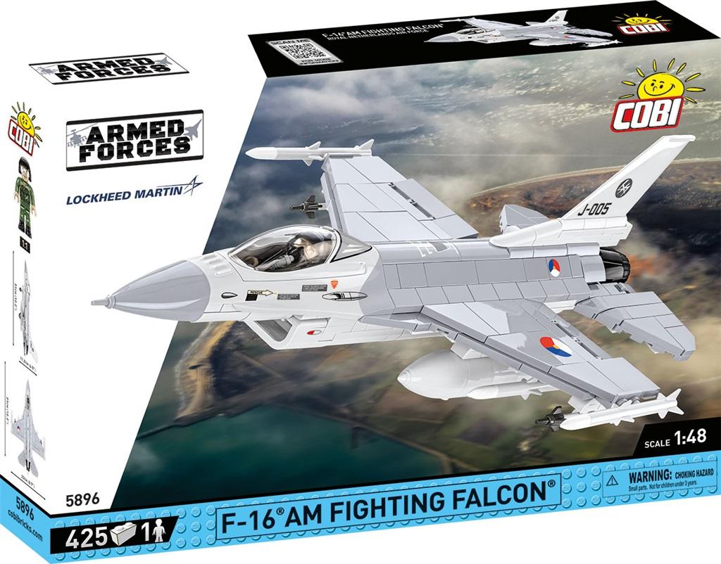 COBI-5896 F-16(R)AM Fighting Falcon 425 klocków 1 figurka Grupa Wiekowa 8+ Skala 1:48 F-16 Fighting Falcon to wielozadaniowy samolot zaprojektowany przez amerykańską wytwórnię General Dynamics. Od 1993 roku jest produkowany przez megakoncern zbrojeniowy Lockheed Martin. Znajduje się na wyposażeniu sił powietrznych kilkudziesięciu krajów na całym świecie. F-16 w wersji AM zostały wyprodukowane w Europie na jednej z linii produkcyjnych General Dynamics. Z 425 najwyższej jakości klocków konstrukcyjnych COBI wybudujesz najpopularniejszy na świecie licencyjny samolot myśliwsko-szturmowy F-16(R) AM FIGHTING FALCON(R) w barwach holenderskich (DUTCH AIR FORCE). Zestaw został starannie zaprojektowany w modelarskiej skali 1:48. Klocki zostały pokryte wysokiej jakości nadrukami. Samolot posiada podwieszone rakiety AIM-9 SIDEWINDER oraz AIM-120 AMRAM. Uzbrojenie jest odpinane i można je dowolnie konfigurować lub umieścić na innych samolotach z kolekcji Armed Forces! Do zestawu dołączona jest figurka holenderskiego pilota wyposażonego w kask i maskę tlenową z wężykiem. Znajdują się na niej nadruki zawierające patche holenderskich Sił Powietrznych i pilotów F-16. Całość zestawu uzupełnia klockowa podstawka ekspozycyjna z tabliczką zawierającą nazwę zestawu, flagę narodową oraz logotyp Lockheed Martin. Dzięki intuicyjnej instrukcji budowa jest prosta i nie sprawi problemów mniej zaawansowanym budowniczym. Zestaw spełni oczekiwania miłośników lotnictwa, militariów i klockowych pasjonatów. F-16 AM będzie się doskonale prezentował zarówno u dorosłego kolekcjonera, jak i w pokoju nastolatka. Buduj historię z COBI! 425 wysokiej jakości elementów, Wyprodukowane w UE przez firmę z ponad 35-letnią tradycją, Spełniają normy bezpieczeństwa dotyczące produktów dla dzieci, W pełni kompatybilne z innymi markami klocków konstrukcyjnych, Zastosowano tylko trwałe nadruki bez użycia naklejek, Czytelna i intuicyjna instrukcja oparta na rysunkach i ikonach, Skala 1:48 Wymiary modelu (dł x szer x wys): 31cm x 22cm x 11,5cm