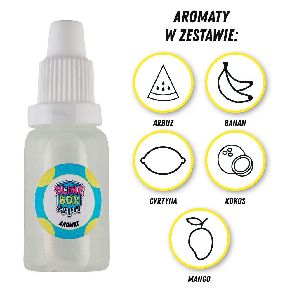 Zestaw pięciu różnych aromatów spożywczych w płynie. Nadadzą zapach samodzielnie zrobionym slime oraz squishy.