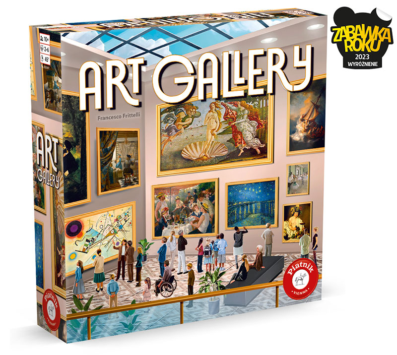 Ekscytujący konkurs na najsłynniejsze obrazy świata To muzeum po prostu trzeba zobaczyć: bo gdzie indziej można podziwiać tajemniczą Mona Lisę, mistyczną Gwiaździstą noc czy Biednego poetę podczas jednej wizyty? Dwie do sześciu osób w wieku od 10 lat jako przewodnicy szukają najlepszej trasy przez tę wyjątkową wystawę sztuki w Galerii Sztuki. Autor Francesco Frittelli łączy czterdzieści osiem najsłynniejszych obrazów z najsłynniejszych muzeów świata w tej wspaniale zaprojektowanej grze rodzinnej. Przewodnicy poruszają się zarówno po muzealnym sklepiku, jak i w salach galerii, których ilość i wielkość na modułowej planszy jest uzależniona od bawiących się osób. Wyjątkowa wizyta w Galerii Sztuki Znana na całym świecie Galeria Sztuki to nie tylko muzeum najwspanialszych dzieł sztuki na świecie, ale także słynie z zapewniania odwiedzającym pierwszorzędnych i pouczających wycieczek. No to ruszamy Przygotowania trwają i to od Was zależy jak potoczy się rozgrywka. Wcielcie się w role przewodników, przemierzajcie muzealne sale i uważnie przyglądajcie się obrazom. Wybierzcie najlepszą trasę przez muzeum i zdecydujcie o spójnej kolejności. Ci, którym się to uda, będą mogli na koniec zaprezentować swoją wycieczkę ciekawskim turystom i otrzymać pochwałę i uznanie. W każdej rundzie każdy gracz ma cztery ruchy i musi na polu akcji umieścić jedną odkrytą i jedną zakrytą kartę akcji. Ci, którzy zastosują najlepszą taktykę, zostaną nagrodzeni w późniejszym rozdaniu płytek i kart malarskich. W sklepie oraz w galerii mogą dzięki temu dodać do swojej kolekcji - niemal prawdziwego - Botticellego, Raffaela czy Kandinsky'ego. Ilustrowana instrukcja gry zawiera bardziej szczegółowe informacje, takie jak nazwisko artysty i rok pochodzenia danego dzieła. Twoja własna kolekcja obrazów będzie się stale powiększać w miarę postępów w grze. Należy jednak zwracać uwagę na symbole na kartach obrazów, by zdobyć jak najwięcej punktów w końcowej punktacji. Kto w końcu znalazł najlepszą trasę przez galerię, zostanie nagrodzony nie tylko pochwałami i uznaniem, ale i zwycięstwem. Wizyta w Galerii Sztuki trwa około 45 minut.