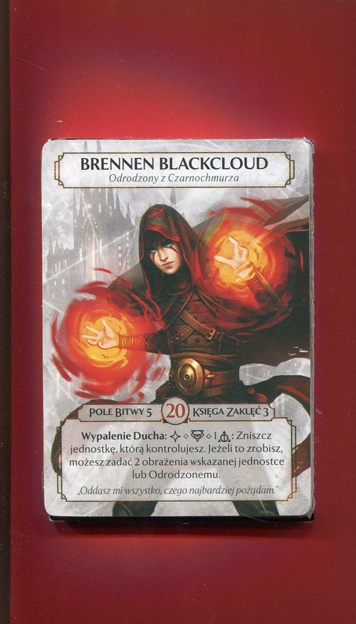 Na szczycie świata znajduje się Czarnochmurze - posępne i szacowne miasto... W rozszerzeniu Dzieci Czarnochmurzai pojawia się Brennen Blackloud i jego talia oparta na magii ceremonialnej. W tym zestawie zawarte są: Odrodzony Brennen Blackcloud x 1 Karty Pieśń Ochrony x 3 Pieśń Umarłych x 3 Przywołanie Widma Grozy x 3 Trucizna x 3 Duszenie x 3 Łańcuchy Krwi x 3 Regresja x 3 Ninja z Czarnochmurza x 3 Łucznik Ognia x 3 Karmazynowy Zamachowiec x 3 Przyzwańcy Widmo Grozy x 2