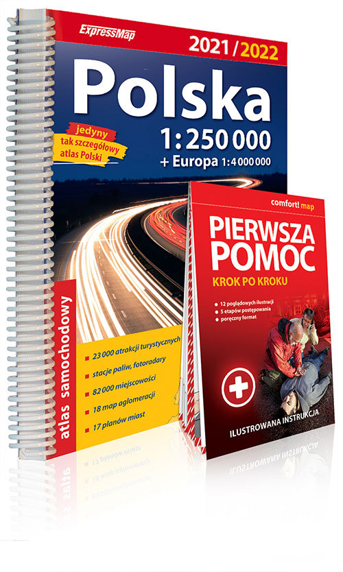 Z atlasem samochodowym Polski wydawnictwa ExpressMap podróż po kraju będzie prawdziwą przyjemnością. To jedyna tak szczegółowa tego typu publikacja na rynku. Uwzględnia 82 tys. miejscowości i 365 tys. km dróg. Publikacja jest użyteczna zarówno dla zawodowych kierowców, jak i turystów podróżujących samochodem – zaznaczono w niej także atrakcje turystyczne. Atlas zawiera: • aktualny stan sieci drogowej, a także drogi w budowie i planowane do 2023 r., • autostrady i drogi ekspresowe z nazwami węzłów, • krajową i międzynarodową numerację dróg, • odległości drogowe, • stacje paliw z podziałem na sieci, • fotoradary stałe, odcinkowe pomiary prędkości, • wybrane motele i hotele, • granice parków narodowych i krajobrazowych, • miejscowości atrakcyjne turystycznie, • 23 tys. atrakcji turystycznych, • plastyczną rzeźbę terenu, • skorowidz ponad 71 tys. miejscowości z terenu Polski wraz z informacją o województwie i powiecie, • 18 tranzytowych map miast, • 17 planów miast, • atlas Europy 1:4 000 000, • mapę dróg objętych systemem viaTOLL i płatnych autostrad, • formularz wspólnego oświadczenia o zdarzeniu drogowym. Dodatkowo wygodna w składaniu dwustronnie laminowana i ilustrowana instrukcja udzielania pierwszej pomocy, opracowana na podstawie obowiązujących w roku wydania wytycznych Europejskiej Rady Resuscytacji z 2010 roku.