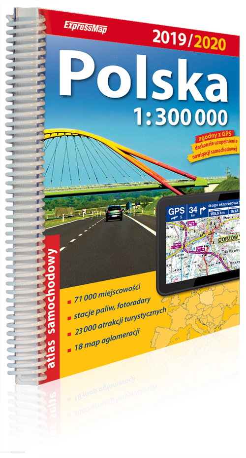 Planujesz samochodową podróż po Polsce? Zabierz ze sobą atlas ExpressMap – będzie niezastąpionym towarzyszem wyprawy. Publikacja jest użyteczna zarówno dla zawodowych kierowców, jak i turystów podróżujących samochodem – zaznaczono w niej także atrakcje turystyczne. Atlas zawiera: • aktualny stan sieci drogowej, a także drogi w budowie i planowane do 2021 r., • 365 tys. km dróg, autostrady i drogi ekspresowe z nazwami węzłów, • krajową i międzynarodową numerację dróg, • odległości drogowe, • stacje paliw z podziałem na sieci, • fotoradary stałe, odcinkowe pomiary prędkości • wybrane motele i hotele, • 23 tys. atrakcji turystycznych • granice parków narodowych i krajobrazowych, • miejscowości atrakcyjne turystycznie, • plastyczną rzeźbę terenu, • skorowidz ponad 71 tys. miejscowości z terenu Polski wraz z informacją o województwie, • 18 tranzytowych map miast.