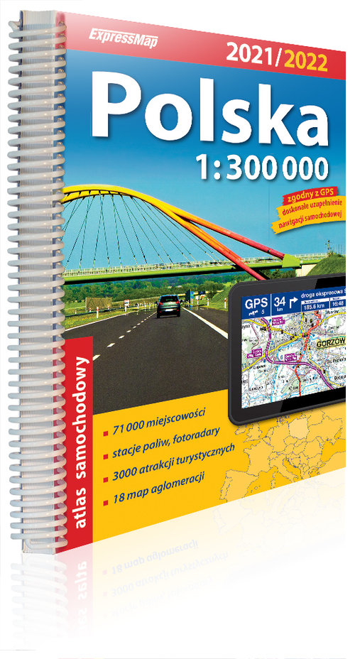 Planujesz samochodową podróż po Polsce? Zabierz ze sobą atlas ExpressMap – będzie niezastąpionym towarzyszem wyprawy. Publikacja jest użyteczna zarówno dla zawodowych kierowców, jak i turystów podróżujących samochodem – zaznaczono w niej także atrakcje turystyczne. Atlas zawiera: • aktualny stan sieci drogowej, a także drogi w budowie i planowane do 2023 r., • 365 tys. km dróg, autostrady i drogi ekspresowe z nazwami węzłów, • krajową i międzynarodową numerację dróg, • odległości drogowe, • stacje paliw z podziałem na sieci, • fotoradary stałe, odcinkowe pomiary prędkości • wybrane motele i hotele, • 3 tys. atrakcji turystycznych • granice parków narodowych i krajobrazowych, • miejscowości atrakcyjne turystycznie, • plastyczną rzeźbę terenu, • skorowidz ponad 71 tys. miejscowości z terenu Polski wraz z informacją o województwie, • 18 tranzytowych map miast.