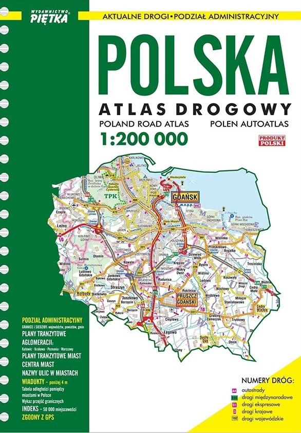 Samochodowy atlas Polski w skali 1: 200 000 a w nim:- Polska administracyjna 1: 750 000- okolice Katowic z nazwami ulic- okolice Poznania 1:100 000 - okolice Warszawy 1:100 000- plany miast 1: 20 000- indeks ponad 50 000 miejscowości- tabela odległości, znaki drogowe- punkty karne, przejścia graniczne.