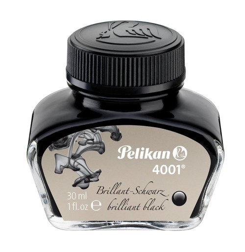 Atrament w szklanej butelce. Tradycyjny atrament w szklanej butelce z wgłębieniem, stanowiącym podstawkę pod pióroOryginalny kształt butelki od 1897.