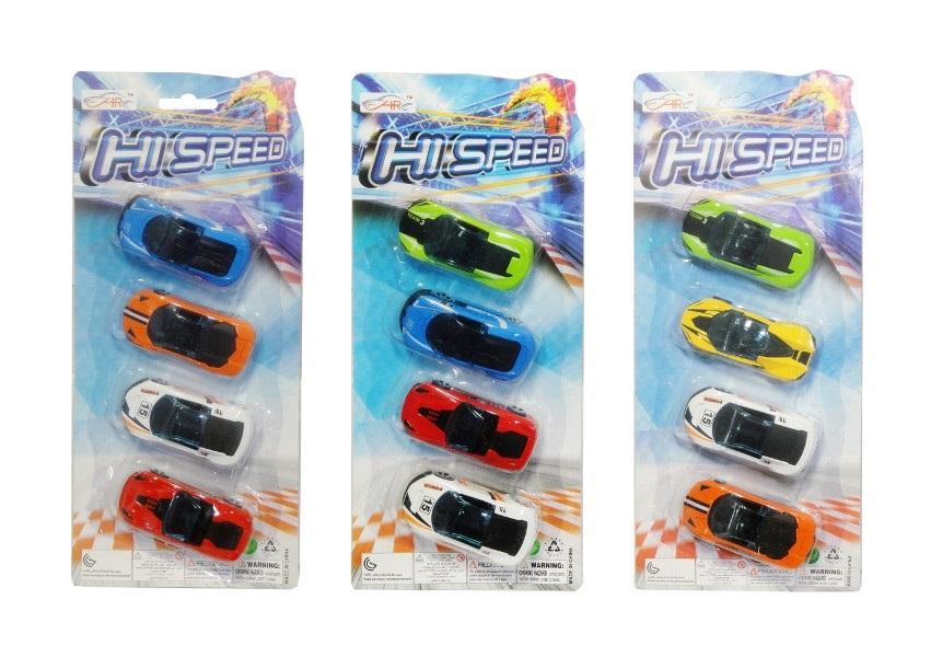 Zestaw 4 kolorowych metalowych autek. W zestawie znajdują się autka wyścigowe. Przydatne będą podczas zabawy w wyścigi samochodowe. Produkt występuje w kilku wersjach kolorystycznych, wybierany losowo. Cena dotyczy jednej sztuki. Zabawka dla dzieci od 3 lat. Produkt zapakowany w kartonową podstawkę z przezroczystym kloszem