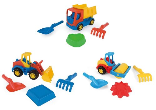 Zestaw zawiera plastikowy pojazd ( wywrotka, spychacz lub walec - wybierane losowo) oraz akcesoria do zabawy w piaskownicy. Dla dzieci od 1 roku życia.