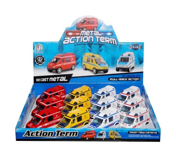 Plastikowo-metalowy samochód ratunkowy. Zabawka na napęd cierny typu pull-back. Produkt dostępny w kilku wersjach kolorystycznych, wybierany losowo. Cena dotyczy jednej sztuki. Produkt dla dzieci od 3 lat.
