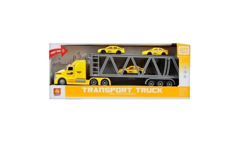 Auto ciężarowe MEGA CREATIVE zapewnia dziecku wspaniałą zabawę dzięki funkcjom jakie posiada Idealny samochód dla każdego fana motoryzacji Ciężarówka posiada lawetę która przewozi trzy wyścigowe samochody w kolorze żółtym. Laweta otwierana z tyłu dzięki czemu samochody szybko i łatwo mogą zjechać z naczepy. Pojazd posiada efekty dźwiękowe, świetlne oraz dodatkowo funkcje Pull Back, dzięki czemu po pchnięciu ciężarówki do przodu, kontynuuje jazdę samodzielnie. Zestaw w skali 1 50. Całość wykonana z plastiku. Przeznaczona dla dzieci w wieku 3 .Wymaga zasilania bateriami 3 x AG13- załączono do zestawu