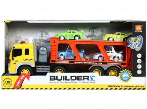 Ciężarówka posiada lawetę która przewozi cztery wyścigowe samochody w kolorach: zielonym, żółtym, niebieskim oraz białym. Laweta otwierana z tyłu dzięki czemu samochody szybko i łatwo mogą zjechać z naczepy. Całośc wykonana z plastiku. Przeznaczona dla dzieci i w wieku: 3+.Wymaga zasilania bateriami 3xLR44 (załączono).