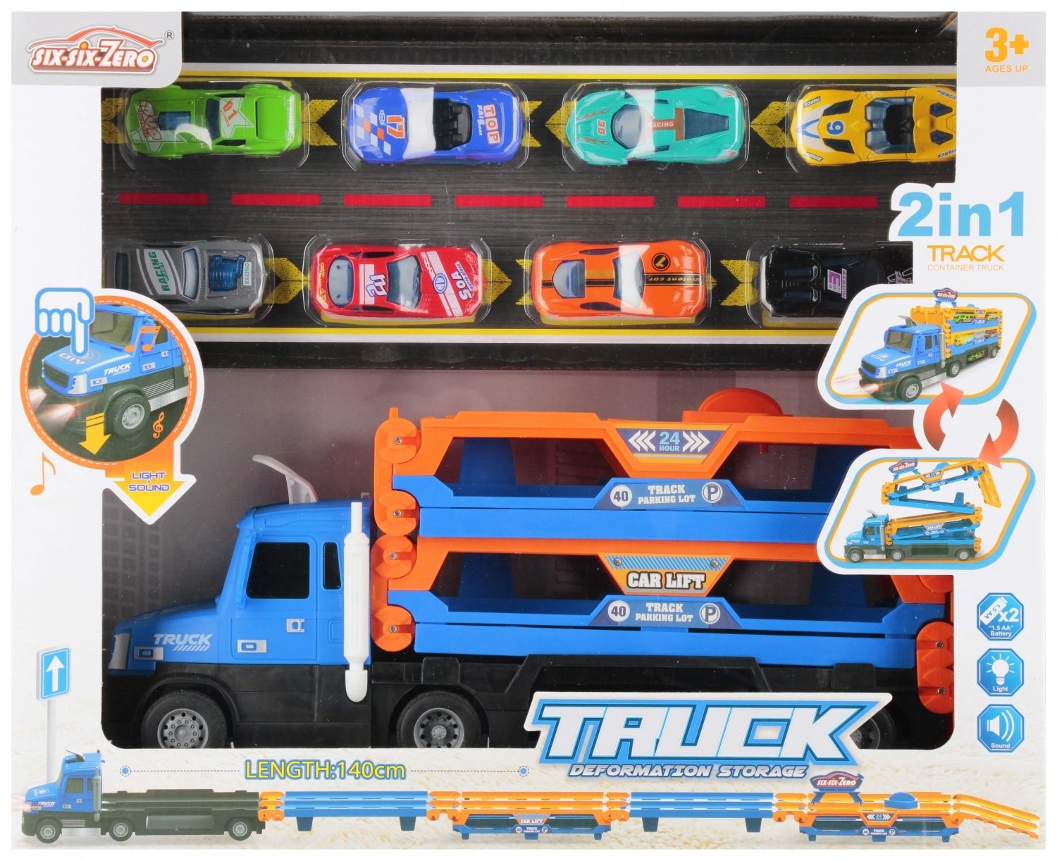 Zawartość zestawu: samochód transporter, 8 x samochody. Zestaw wykonany z plastiku.