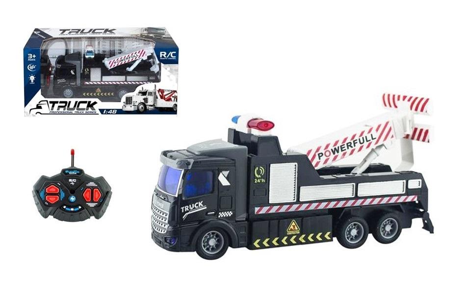 Auto holownik sterowany pilotem. Porusza się do przodu, do tyłu, skręca w prawo i w lewo. Zabawka świeci również kolorowym światełkiem. Produkt działa na baterie typu AA. Baterie nie są załączone do zabawki. Zabawka zapakowana w kartonowe opakowanie z przezroczystym okienkiem. Zabawka przeznaczona dla dzieci od 3 lat. Podane wymiary są wymiarami opakowania.