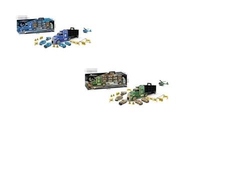 Auto + kontener + auta + akcesoria - auto ciężarowe, które służy jako walizka, a w środku małe samochodziki. W zestawie 5 samochodów, helikopter i znaki drogowe.