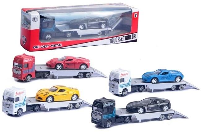 Wyrusz w trasę pełną emocji z zestawem transportowym Truck & Trailer, który przenosi zabawę autkami na zupełnie nowy poziom. Ten wyjątkowy komplet to połączenie potężnej ciężarówki oraz smukłego auta sportowego, tworzące razem nierozerwalny duet gotowy na każde logistyczne wyzwanie. Serce zestawu stanowi solidna laweta wyposażona w funkcjonalny, opuszczany podjazd, dzięki któremu załadunek i rozładunek wyścigówki przebiega płynnie i realistycznie. Każdy element został zaprojektowany z dbałością o detale, a metalowe wykończenie typu die-cast gwarantuje nie tylko elegancki wygląd, ale przede wszystkim wytrzymałość niezbędną podczas najbardziej intensywnych manewrów na dywanie.