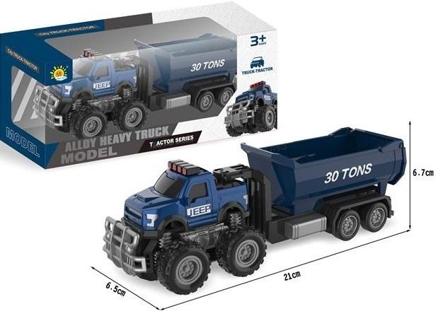 Model wywrotki Alloy Heavy Truck z serii T. Actor to doskonały wybór dla każdego fana dużych maszyn i pojazdów budowlanych. Ta realistycznie odwzorowana ciężarówka typu ciągnik z naczepą wywrotką charakteryzuje się solidną metalową konstrukcją i masywnymi, terenowymi kołami, co gwarantuje jej trwałość i możliwość zabawy w różnych warunkach. Dominujący niebieski kolor z akcentami imitującymi chrom oraz napis JEEP na masce nadają jej agresywny i profesjonalny wygląd. Na wywrotce widnieje oznaczenie 30 TONS, dodające realizmu. Model jest przeznaczony dla dzieci od 3 roku życia. Ta replika zapewni mnóstwo frajdy podczas odtwarzania scen z placu budowy lub organizowania wyścigów w terenie.