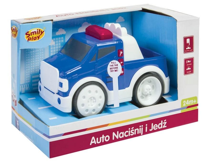 Auto Policję można wprawić w ruch naciskając przycisk na dachu. Zabawka aktywizująca, zachęca dziecko do zabawy. Ma 3 przyciski funkcyjne. Każdy z przycisków to inny realistyczny dźwięk: odgłos silnika i dwa sygnały pojazdu uprzywilejowanego na drodze. Naciskając napis "REV UP" słychać mocne gazowanie pojazdu i zapala się kogut na dachu. Auto Policja jest wykonana z solidnego materiału. Dziecko może ją zabrać wszędzie i cieszyć się zabawą w każdym miejscu. Zabawka rozwija umiejętności fizyczne dziecka oraz motywuje do ruchu przy czym dostarcza wiele frajdy podczas zabawy. • Naciśnij i jedź • Przyciski dźwiękowe • światło Wiek: 2L+ Baterie: 2 x AAA dołączone Bezpieczeństwo: EN71-1, EN71-2, ENT1-3, EN62115