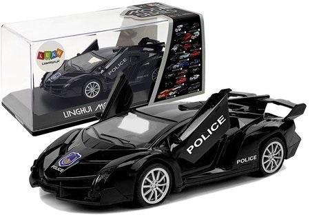Auto Sportowe z Naciągiem i Dźwiękiem Policyjne Czarne Spraw dziecku wspaniały prezent! Samochodziki to najpopularniejsze zabawki, które są uwielbiane przez chłopców w każdym wieku. Służą one do przeróżnych zabaw, które ogranicza tylko wyobraźnia dzieci. Wyjątkowy samochód policyjny do zabawy. Dzięki tej zabawce, Twoje dziecko będzie mogło bawić się godzinami w pościgi policyjne. Mnogość zabaw z pewnością sprawi, że dziecko nie będzie mogło oderwać się od swojego nowego pojazdu. Samochód wyścigowy z napędem pull-back wykonany został z plastiku na gumowych oponach. Zabawka rozbudzi w Twoim dziecku dużą ciekawość, która pozwoli rozwijać wyobraźnię dziecka i wpłynąć na prawidłowy rozwój. Autko posiada efekty świetlne oraz dźwiękowe podczas jazdy. Dźwięk sygnałów policyjnych podczas jazdy umili czas dziecku. Dodatkową zaletą są otwierane drzwi pojazdu. Autko wykonane w pięknym czarnym kolorze. Wymiary samochodu: 17 cm x 6.5 cm x 4 cm Wymiary pudełka: 20.5 cm x 8.5 cm x 9.5 cm Samochód zasilany dwoma bateriami AAA 1.5V (w zestawie). Zabawka posiada certyfikat CE i jest zgodna z normą EN 71. Zapakowana jest w plastikowe pudełko z przezroczystą pokrywą, dzięki czemu idealnie nadaje się na prezent oraz do kolekcjonowania.