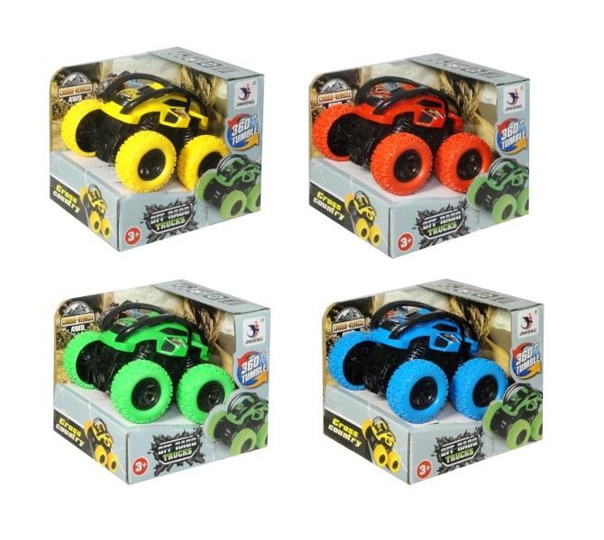 Auto terenowe przewrotka. Pojazd obraca się o 360 stopni. Posiada napęd friction. Podane wymiary są wymiarami opakowania. Zabawka zapakowana w kartonowe opakowanie z okienkiem. Produkt występuje w kilku wersjach kolorystycznych, wybierany losowo.