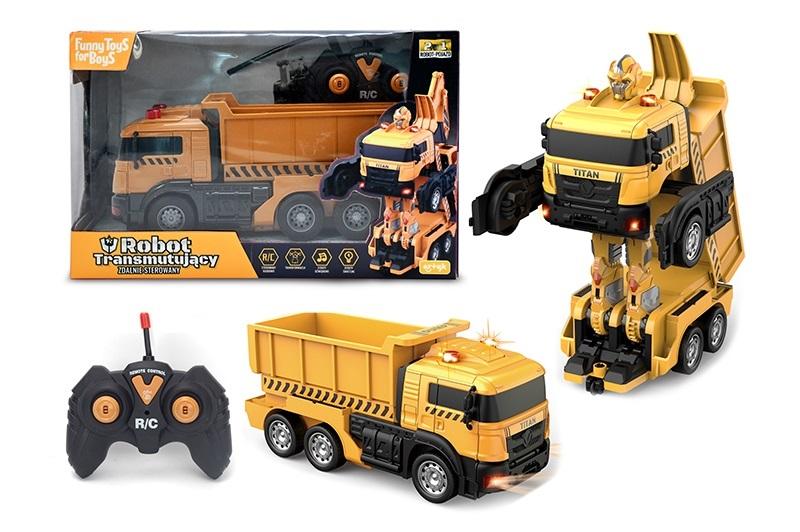 W zestawie: wywrotka, pilot, śrubokręt, kabel ładujący auto, funkcje: pełen zakres jazdy, światła podczas jazdy, ruchoma skrzynia samowyładowcza, transformacja w robota za pomocą przycisku na pilocie, 2 tryby: jazda lub jazda i muzyka.
