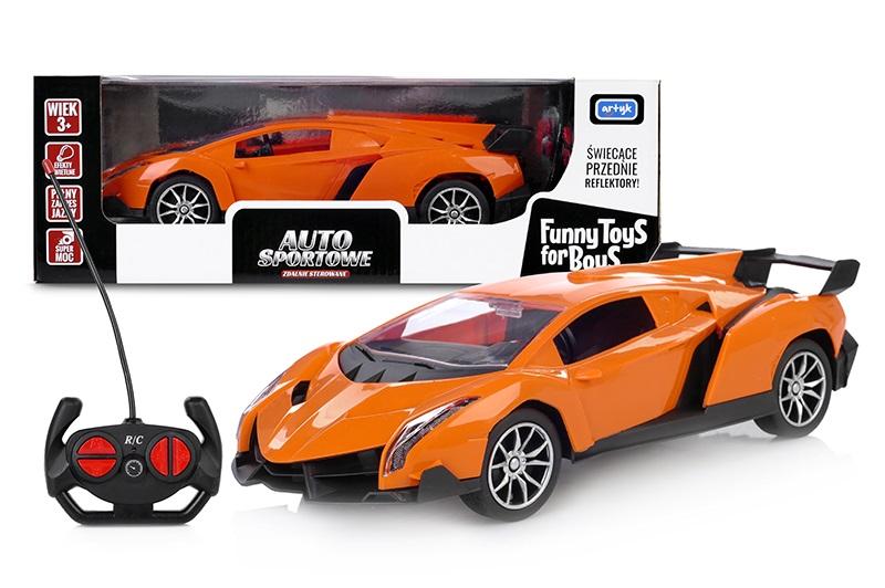 W zestawie: auto dł: 25 cm., pilot, funkcje: pełen zakres jazdy, działające przednie światła podczas jazdy, ustawianie zbieżności kół, wym. opk: 35 x 15,5 x 11,5 cm., 3+