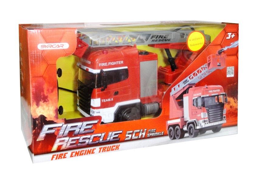 Auto straż pożarna sterowana pilotem . Auto porusza się we wszystkich kierunkach, a także świeci kolorowymi światełkami. Pojazd posiada wysuwaną drabinę oraz jego wąż strzela wodą. Zabawka działa na baterie typu AA (niezałączone) oraz baterię litową.