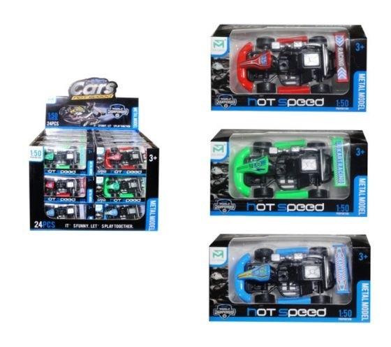 Plastikowo metalowy samochód wyścigowy. Zbierz wszystkie kolory, baw się razem z rodziną lub kolegami i sprawdź czyj samochód pojedzie najdalej. Pojazdy na napęd friction. Zabawka zapakowana w kartonowe opakowanie z przezroczystym okienkiem. Podane wymiary są wymiarami opakowania. Zabawka dla dzieci od 3 lat.