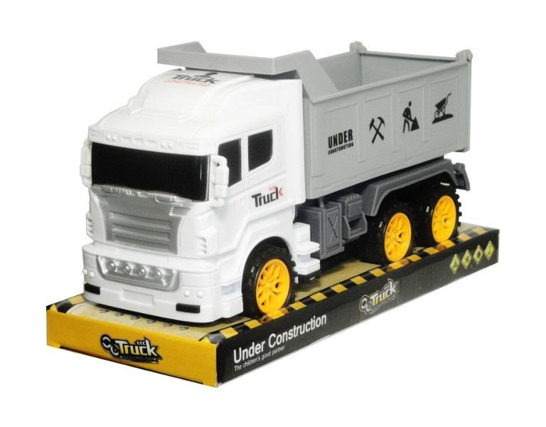 Zabawka ciężarówka wywrotka na napęd cierny. #&Produkt zapakowany w kartonową podstawkę z przezroczystym kloszem. #&Zabawka dla dzieci od 3 lat. #&Podane wymiary stanowią wymiar opakowania.