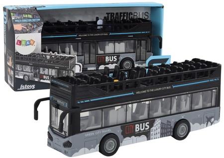 Autobus Miejski Piętrowy 1:16 Napęd Światła Dźwięki Czarny Autobus piętrowy w skali 1:16 to imponująca zabawka, która zachwyci zarówno dzieci, jak i kolekcjonerów modelów. Jego elegancka, czarna karoseria z subtelnymi siwymi akcentami nadaje mu nowoczesny i stylowy wygląd, idealny dla każdego młodego miłośnika motoryzacji. Model autobusu jest wierną repliką rzeczywistego pojazdu, z dbałością o szczegóły, co sprawia, że jest niezwykle realistyczny. Posiada dwie kondygnacje, z otwieranymi drzwiami, które umożliwiają dostęp do wnętrza pojazdu, pozwalając na zabawę i interaktywne korzystanie z modelu. Autobus wyposażony jest w efekty świetlne oraz dźwiękowe, które dodają zabawie dodatkowego wymiaru. Po naciśnięciu odpowiednich przycisków na dachu, można aktywować migające światła oraz realistyczne dźwięki, takie jak sygnał klaksonu czy odgłosy silnika, co potęguje wrażenia z zabawy i wzbogaca doświadczenie użytkownika. Model autobusu posiada napęd frykcyjny, co oznacza, że wystarczy pociągnąć pojazd do tyłu, aby po puszczeniu samodzielnie ruszył do przodu. T Otwierane drzwi w autobusie dodają interaktywności i pozwalają na umieszczanie figurek wewnątrz pojazdu, co może stymulować kreatywną zabawę i rozwijać umiejętności społeczne dzieci. Autobus piętrowy w skali 1:16 to doskonały wybór zarówno jako zabawka, jak i element kolekcjonerski. Jego szczegółowe wykonanie, efekty świetlne i dźwiękowe oraz funkcjonalność sprawiają, że jest idealnym dodatkiem do każdej kolekcji modeli pojazdów lub świetnym prezentem dla młodego entuzjasty motoryzacji. Wymiary autobusu: 28cm x 11cm x 7cm Wymiary opakowania: 33cm x 15,5cm x 9cm Posiada certyfikat CE, ponadto jest zgodny z norma EN71.Przeznaczony dla dzieci powyżej 3 roku życia.