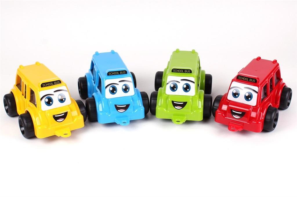 Mały autobus z zabawną postacią, zabierze Cię do szkoły i na wycieczkę do odległych krain.