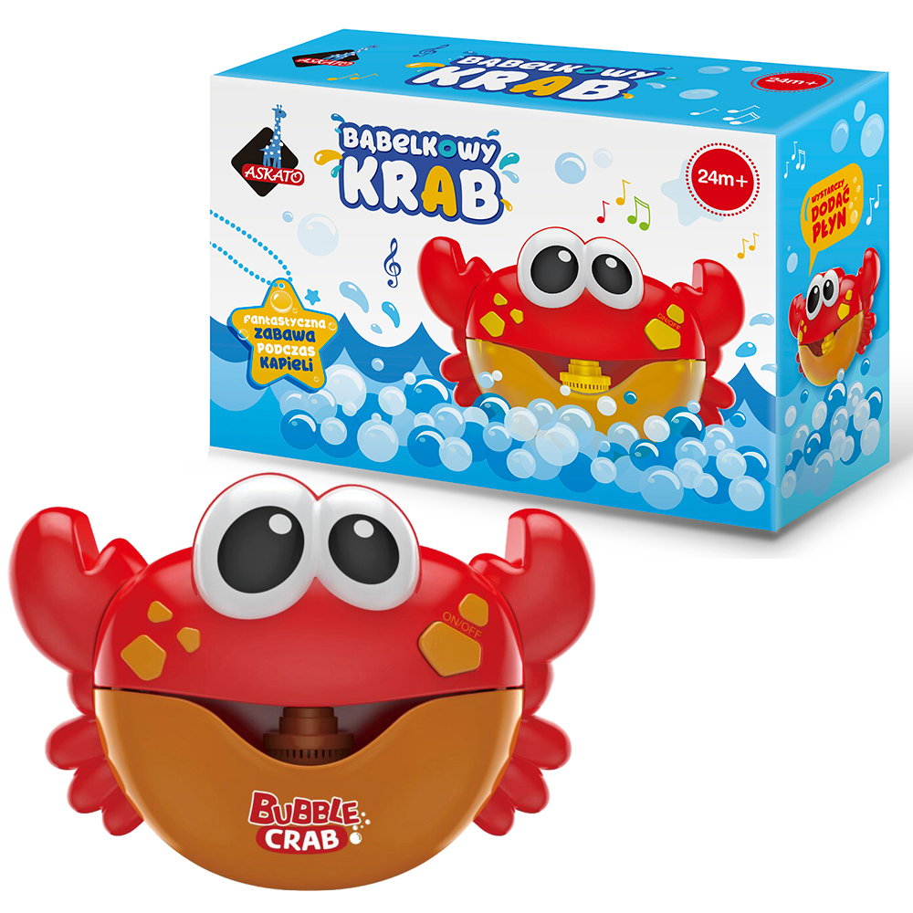 Baw się licząc i łapiąc bąbelki! Super zabawa podczas kąpieli.Krab ma 3 przyssawki, dzięki którym można go przymocować do kafli lub wanny. Aby wytwarzał pianę należy wlać do pojemnika mydło w płynie. Podczas kąpieli dziecko może słuchać także muzyki, gdyż krab wytwarza pianę w rytm melodii. Teraz kąpiel będzie jeszcze bardziej przyjemna. Zasilanie: 2xAA (brak w zestawie) Krab nie jest wodoszczelny - należy uważać, aby nie wpadł do wody! Wiek: 18 miesięcy Wymiary opakowania: 24.5x8.5x16.5 cm