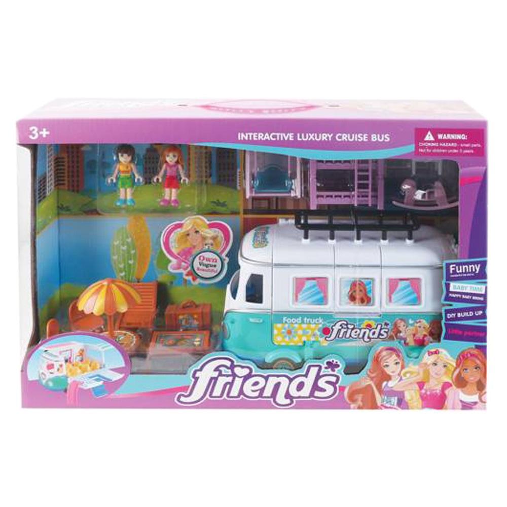 Autobus z huśtawką, bujanym koniem, łóżkiem piętrowym, 2 krzesełkami, lalką dziewczynką i chłopcem, stolikiem plażowym z parasolem i leżakiem oraz grillem. Wymiary opakowania: 43.5 x 12.5 x 37 cm