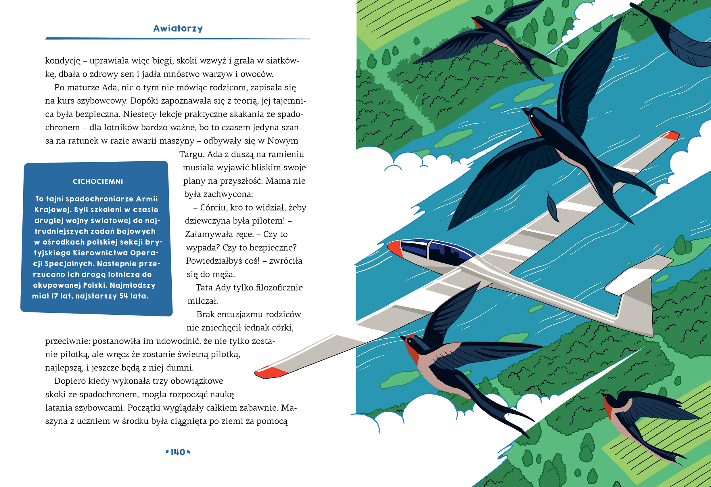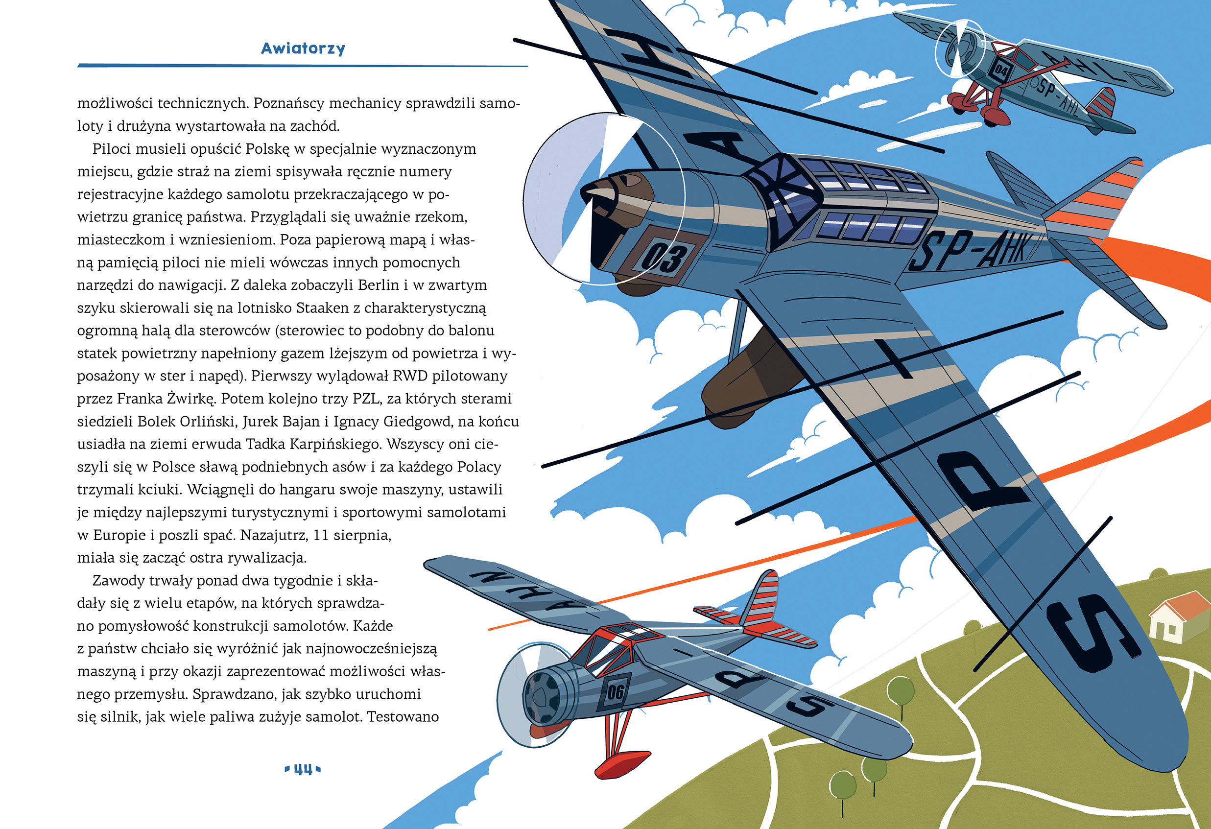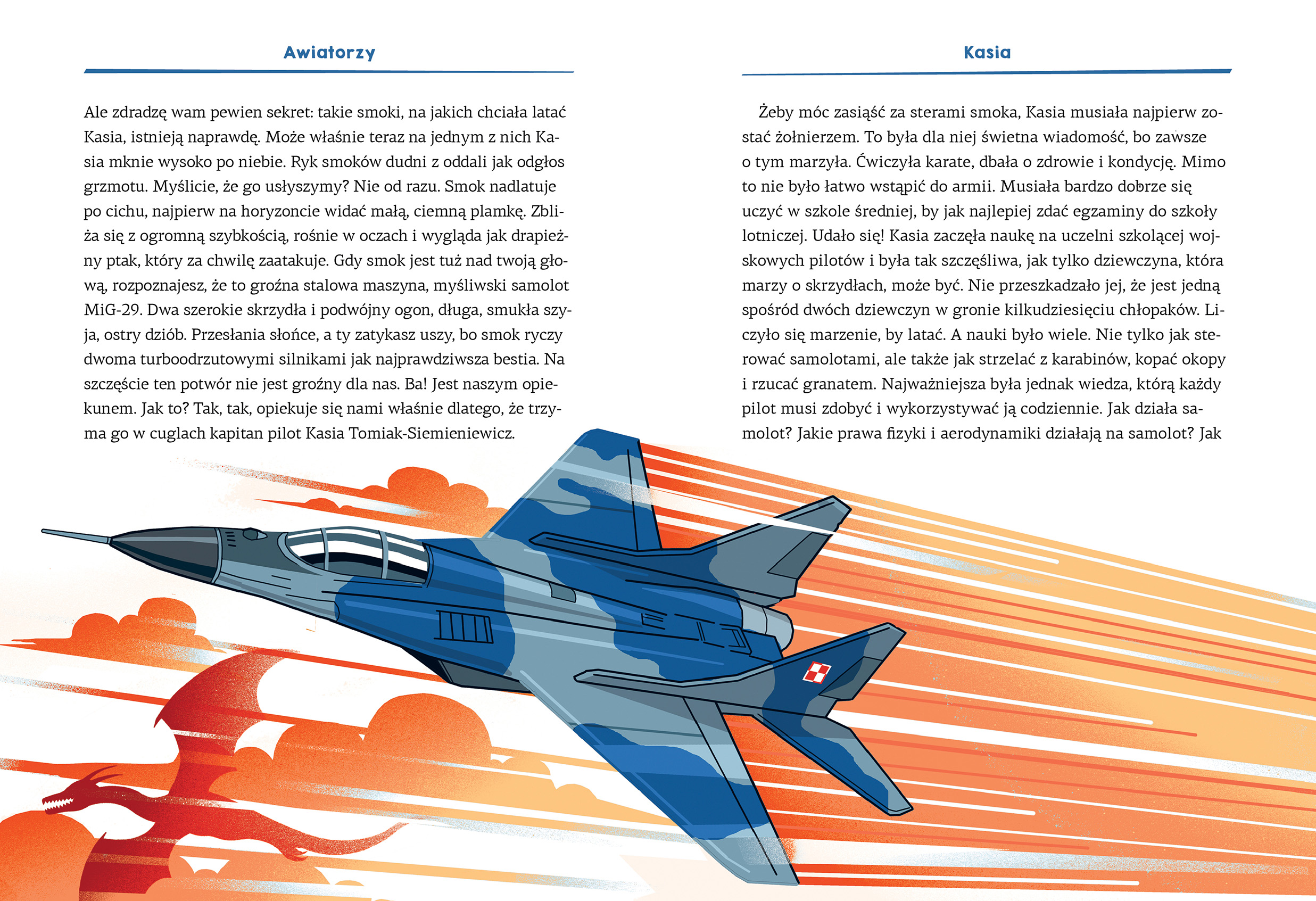 Od dzieciństwa marzyli o podniebnych przygodach, o tym, by siąść za sterami samolotu, wzbić się w powietrze i królować w przestworzach. Poznaj niesamowite historie polskich lotniczek i lotników, poskramiaczy metalowych smoków, pilo-tów oblatywaczy, szybowników, a nawet kosmonautów. Jak długo musiał czekać na poprawę pogody Sebastian Kawa, żeby jako pierwszy (i póki co jedyny) człowiek na świecie przelecieć szybowcem nad Himalajami? Jak wyglądała czekolada, którą Mirek Hermaszewski, jedyny polski kosmonauta, jadł na stacji kosmicznej orbitującej wokół Ziemi? W jakim niecodziennym stroju Stanisław Skarżyński przeleciał samotnie Atlantyk małym turystycznym samolotem (do dziś nikt mniejszym nie pokonał oceanu)? Ile kilometrów musieli przebyć – i ile drużyn pokonać – Żwirko i Wigura w najbardziej wyczerpują-cym rajdzie samolotowym dookoła Europy? Jaki fortel zastosowała Ada Dankowska, najsłynniejsza polska szybowniczka, podczas swojego brawurowego lotu po rekord świata? Marzenia są w zasięgu ręki, a właściwie w zasięgu… skrzydeł! Latać, ale czym? Za każdym lotnikiem stoi – leci! – jego ulubiona maszyna. Samoloty i szybowce mają swoje imiona, często nadawane na cześć konstruktorów, i specjalne podniebne moce, a co najważniejsze: dają się prowadzić tylko wybranym, po prostu najlepszym. Jak okiełznać metalowego smoka MiG-29? Kiedy docisnąć RWD-6, czyli erwudę, żeby przyspieszyć na ostatnich metrach rajdu i wygrać? Jak wprowadzić szybowiec w podniebny taniec… z bocianami i jaskółkami? Dlaczego jedyny na świecie odrzutowy samolot rolniczy dostał imię demona Belfegora? Kolorowe ilustracje, na których wiernie zostały pokazane samoloty, szybowce z różnych czasów, a nawet rakiety kosmiczne, będą nie lada gratką dla przyszłych konstruktorów. A co o swoich przygodach mówią sami bohaterowie? „W lotnictwie kocham to uczucie oderwania od przyziemnego bałaganu. Z góry wszystko wygląda jak piękny malunek. Na dole jest szaro, deszczowo, a ja odrywam się i wychodzę ponad chmury, w słońce i błękit nieba”. Paulina Różyło-Nowicka, pilot oblatywacz „Szybownictwo to piękny sport, dla wnuków i dla dziadków. Można zacząć naprawdę wcześnie i latać bardzo długo, całe życie. To moja pasja, podobnie jak zdobywanie rekordów i wyznaczanie sobie celów. A także radość z sukcesu. Ta radość może być udziałem każdego małego marzyciela”. Ada Dankowska, 15-krotna rekordzistka świata w szybownictwie „Wierzę w to, co robię, i jestem dumna, że mogę nosić mundur. Latanie wojskowymi odrzutowcami to spełnienie moich marzeń. Nie bójcie się marzyć, bo nie ma rzeczy niemożliwych”. kpt. pil. Katarzyna Tomiak-Siemieniewicz, pilot odrzutowca MiG-29, pierwsza Polka, która przekroczyła w locie prędkość dźwięku