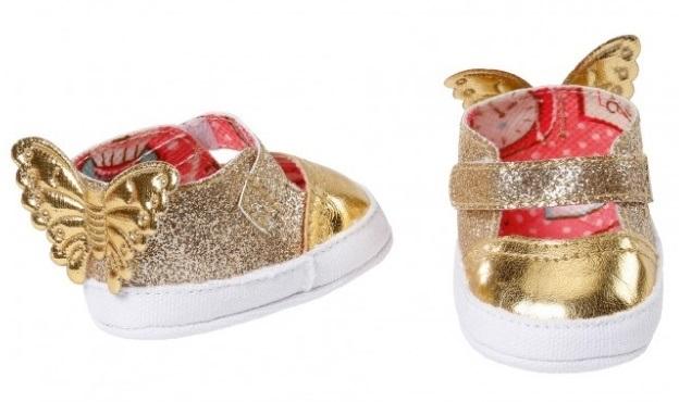 Buciki dla lalki. W tych stylowych bucikach, Baby Annabell będzie świetnie się bawić. Para złotych bucików w stylu glamour jest ozdobiona ślicznymi motylkami, zaczepionymi od strony piętki. Zapinanie na rzep ułatwia zakładanie i zdejmowanie obuwia. Złote butki doskonale pasują do casualowej albo wieczorowej stylizacji twojej laleczki.