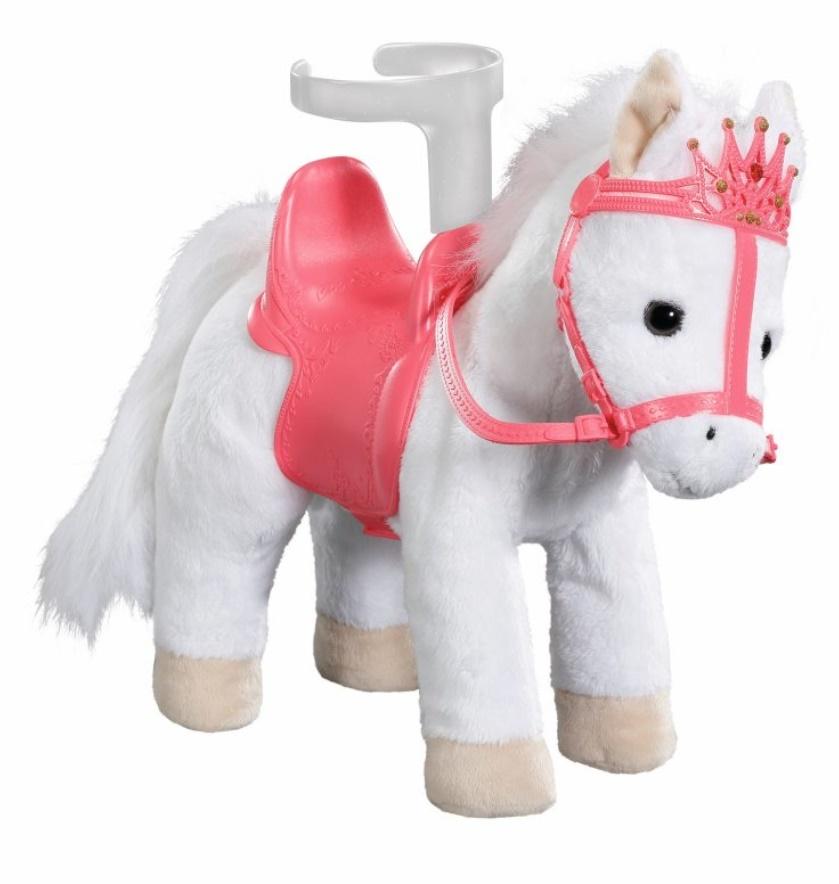 Biały kucyk ma królewski sprzęt z błyszczącą koroną, a jego zabawne, czujne uszy wystają zza niego. Jeśli naciśniesz prawe ucho, kucyk zacznie rżeć lub prychać. Jeśli naciśniesz lewe ucho, usłyszysz stukot kopyt. Mała Annabell jest całkowicie zakochana w swoim zwierzęcym towarzyszu i często całuje kucyka w jego nozdrza. Odpowiada jej odgłosami całowania. Mała księżniczka siedzi wygodnie w siodle podczas jazdy, a uchwyt na lalkę zapewnia jej potrzebną stabilność.