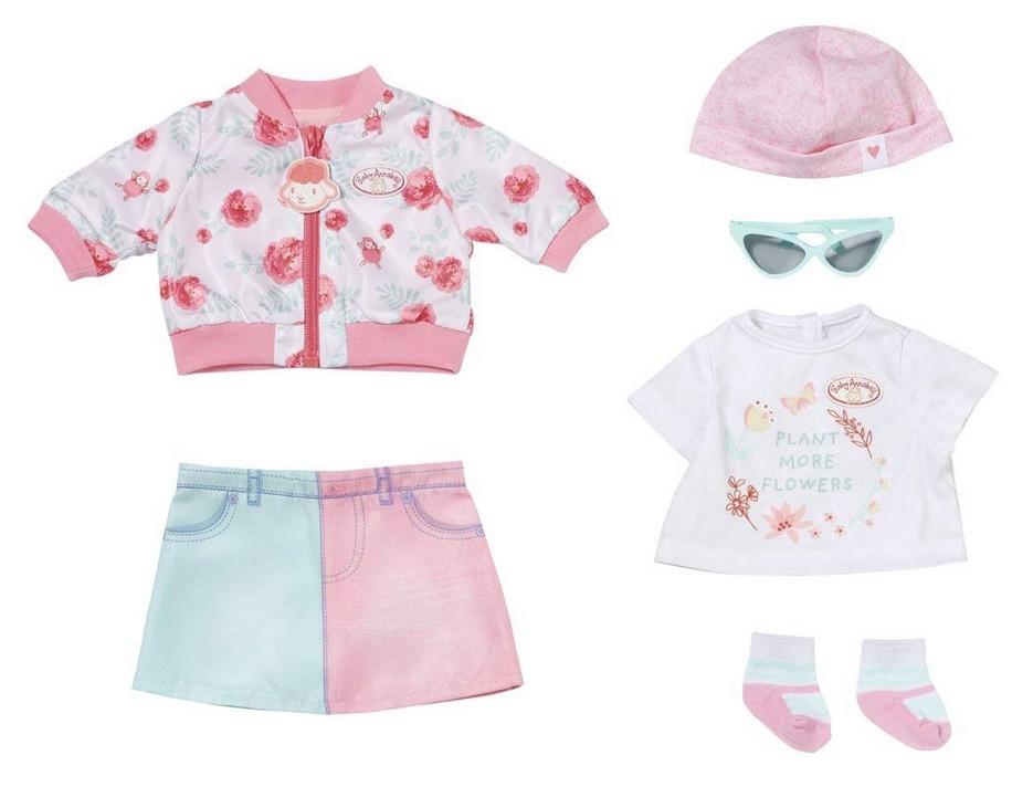 Baby Annabell Deluxe Spring 43 cm z kurtką, spódnicą, koszulą, skarpetkami i czapką. W tym okulary przeciwsłoneczne.