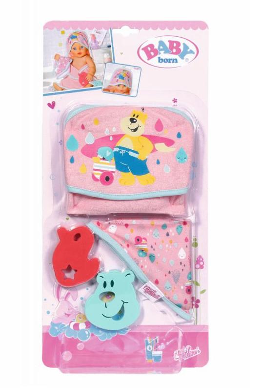 Czas na kąpiel! Zabawa z Baby born to także możliwość wspólnego pluskania się w wodzie. Zestaw kąpielowy zawiera wszystko, co niezbędne podczas kąpieli. W komplecie znajduje się różowy ręcznik z kapturkiem, ozdobiony motywem misia i kaczuszki, ręczniczek w kolorowe kropelki, a także turkusowy misiu i różowa kaczuszka do zabawy w wannie.