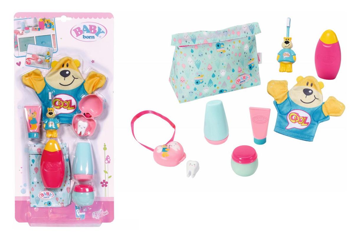 BABY born - Zestaw akcesoriów toaletowych dla lalki 827116. Czy mycie może być świetną zabawą? Oczywiście! Z takim zestawem  akcesoriów do higieny możesz bawić się swoją lalą w wodzie lub odgrywać  scenki, nawiązujące do kąpieli bobasa. Zestaw zawiera jasnoniebieską  kosmetyczkę w pastelowe wzory, 3 pojemniczki - imitujące kosmetyki:  krem, żel do kąpieli i balsam, pastę do zębów z motywem postaci misia, a także zabawną szczoteczkę do zębów w kształcie figurki miśka. Baby born to rezolutna, mała dziewczynka, która traci już mleczaki, dlatego do  zestawu dołączono śliczny pojemniczek w kształcie serduszka z mlecznym  ząbkiem. Gdy lala będzie wymagała kąpieli, na pewno chętnie podda się  wodnym zabiegom z turkusowo - miodową myjką - misiem Bruno.