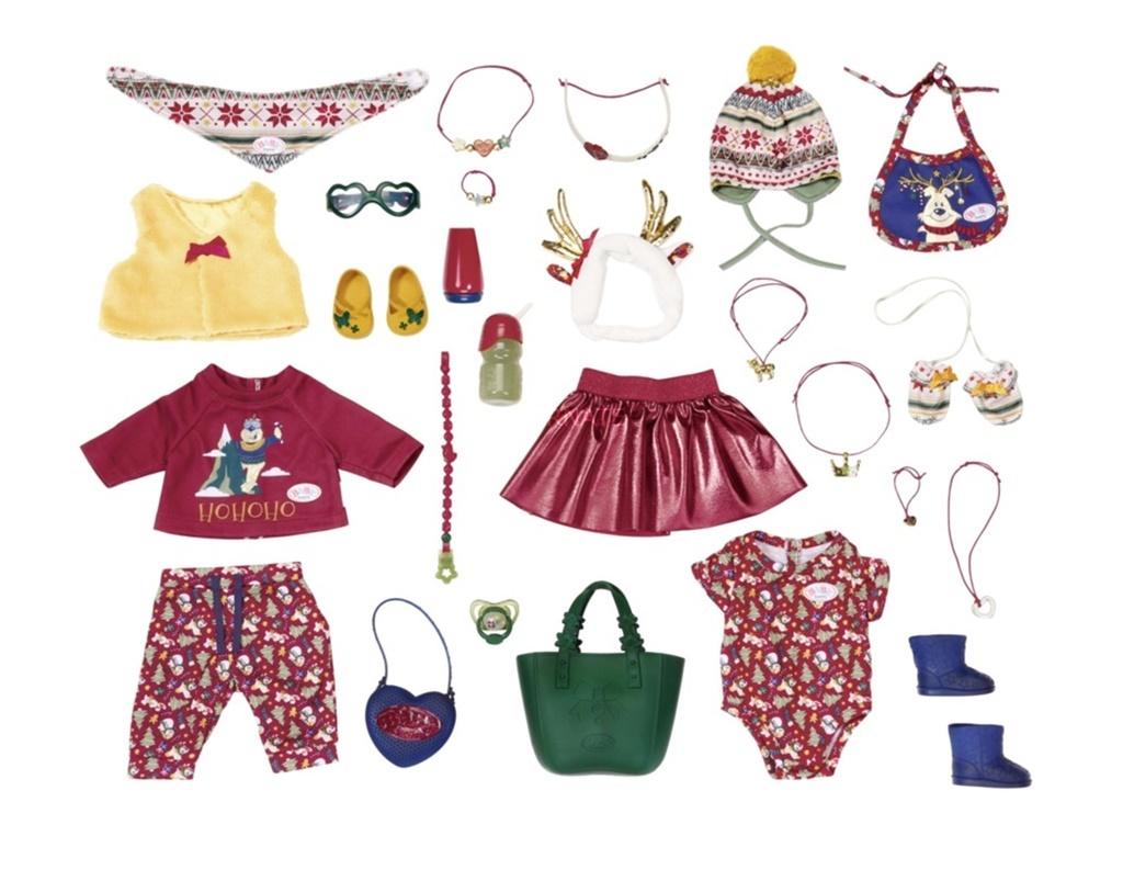Zestaw 24 elementów dla laleczki Baby Born. Zestaw zawiera te same elementy co kalendarz adwentowy m.in: body, czapka, sweter, spodnie sportowe, spódnica, łańcuszek, bransoletka, torba, buciki i wiele innych
