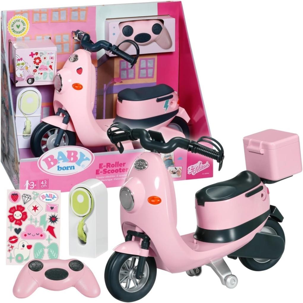 BABY BORN E-Scooter sterowany RC to nowoczesny, elektryczny skuter dla lalek o wysokości 43 cm, który zapewnia niesamowitą zabawę. Wyposażony w pilot zdalnego sterowania, umożliwia dzieciom łatwe kierowanie skuterem, sprawiając, że lalka może poruszać się po pokoju, jak prawdziwy kierowca. Skuter posiada różowe, stylowe wykończenie i dekoracyjne naklejki, które można dowolnie przyklejać.