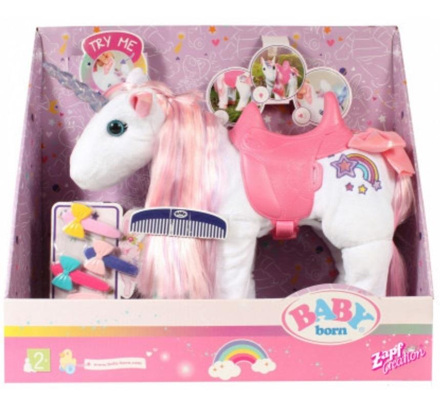 Odkryj pięknego jednorożca Baby Born z różowymi i fioletowymi włosami oraz lśniącym rogiem! Jednorożec umie chodzić i gra piękne piosenki! W zestawie siodło, grzebień i 3 spinki do włosów. Dbaj o swojego jednorożca i stylizuj jego piękne włosy.
